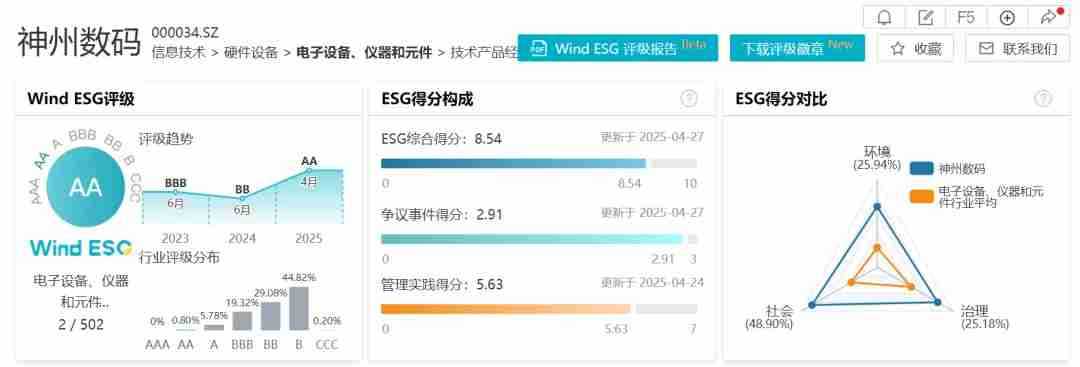 首次突破!!南宫娱乐数码Wind ESG评级升至AA级,,排名电子设备、、、仪器和元件行业第二
