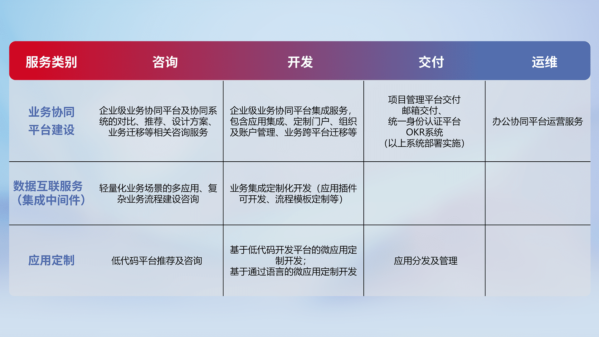 针对钉钉、、、企微、、、IDaas等平台级产品提供产品的规划、、、、方案、、交付、、、定制化开发等服务,,,,实现如统一协同办公、、、智能客户服务、、、混合会议管理、、、、智能数据查询、、、等业务场景,,,实现数字化转型。。。