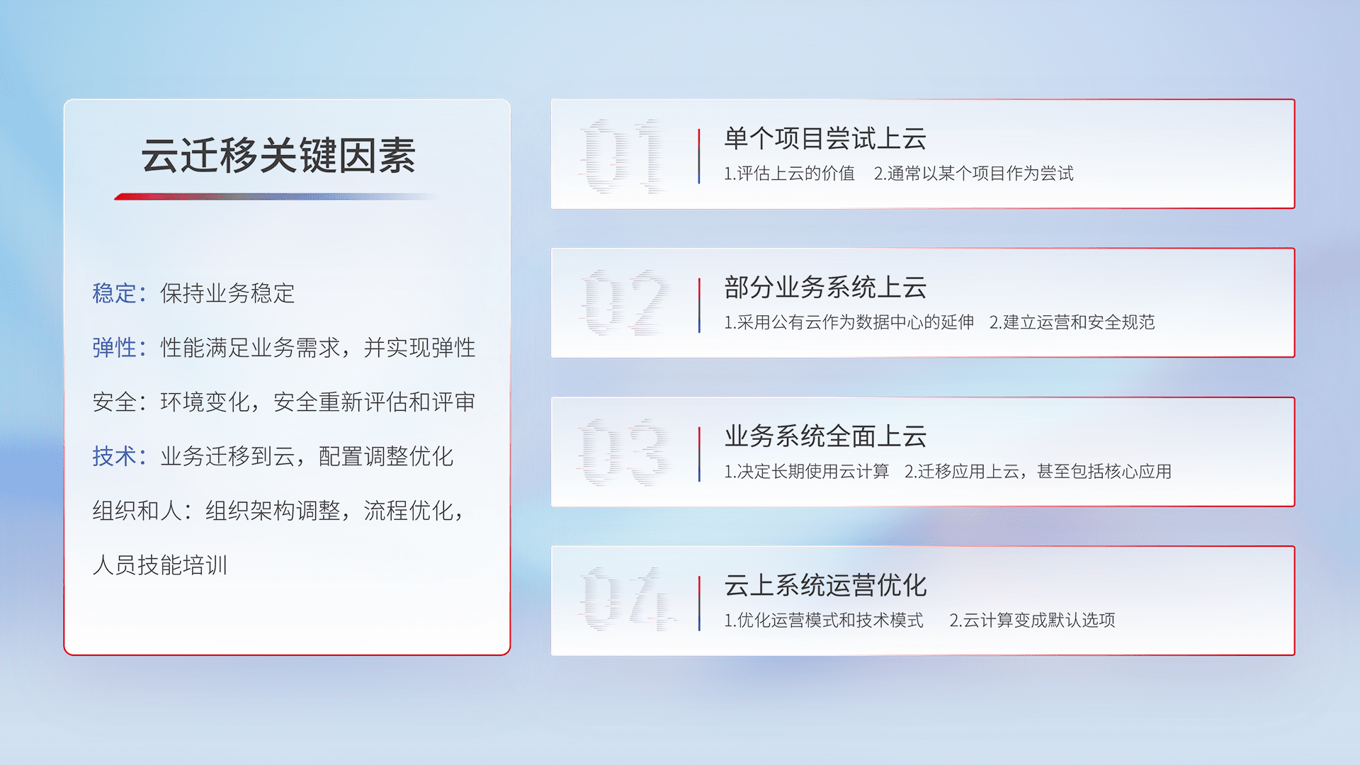 结合实际业务,,,,从规划设计、、、云平台选型、、、、云原生改造、、数据迁移、、、集成交付,,,迁移全过程为客户识别最佳上云路径,,,,做好风险识别管理,,,设计网络架构、、、、身份权限、、安全审计合规、、操作审计、、、、日志审计、、监控告警策略、、多站点容灾设计等,,,,对云上基础设施进行整体规划,,,,提升IT治理水平,,,以满足弹性、、、、高可用、、、高性能的需求。。。。