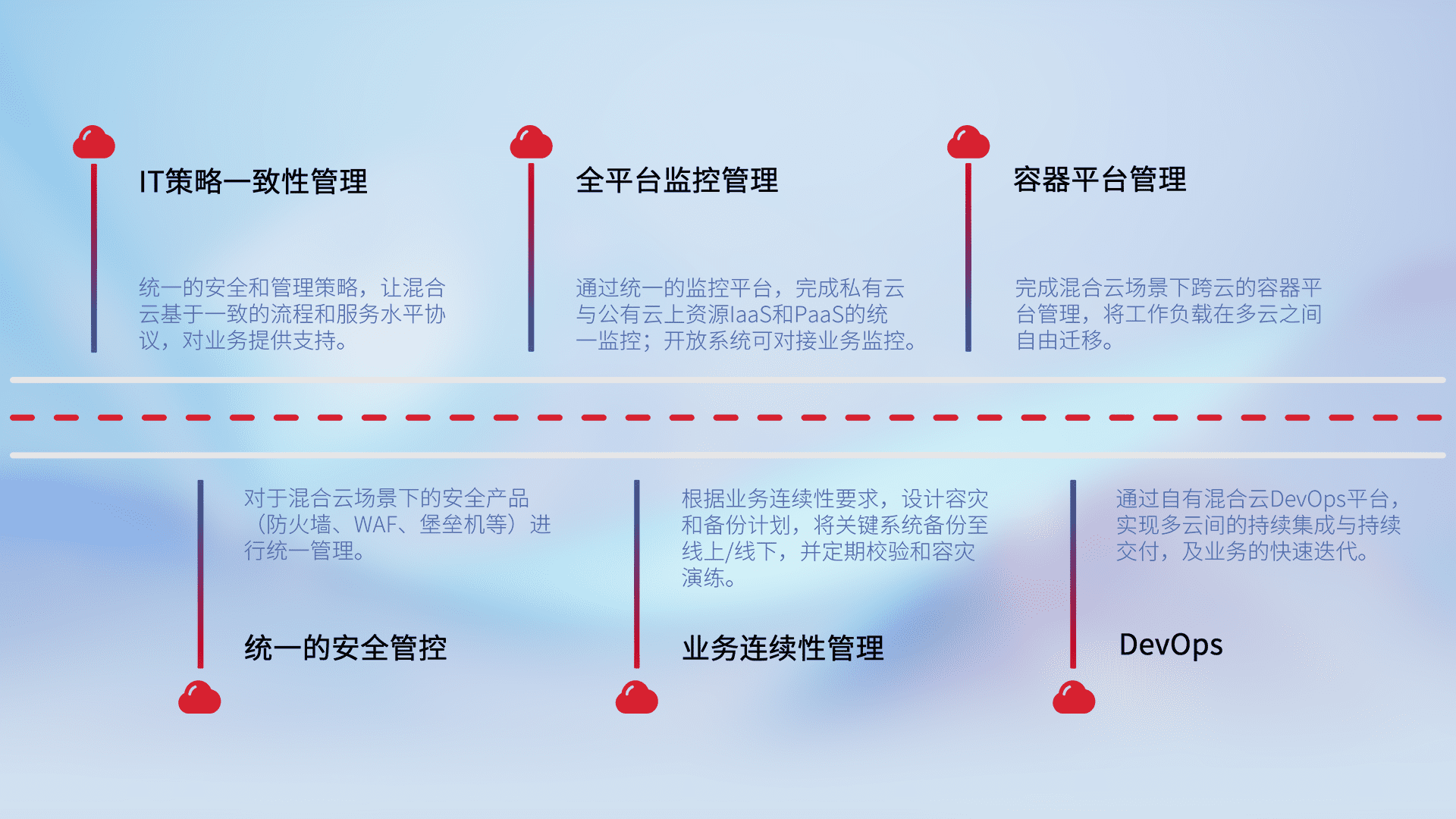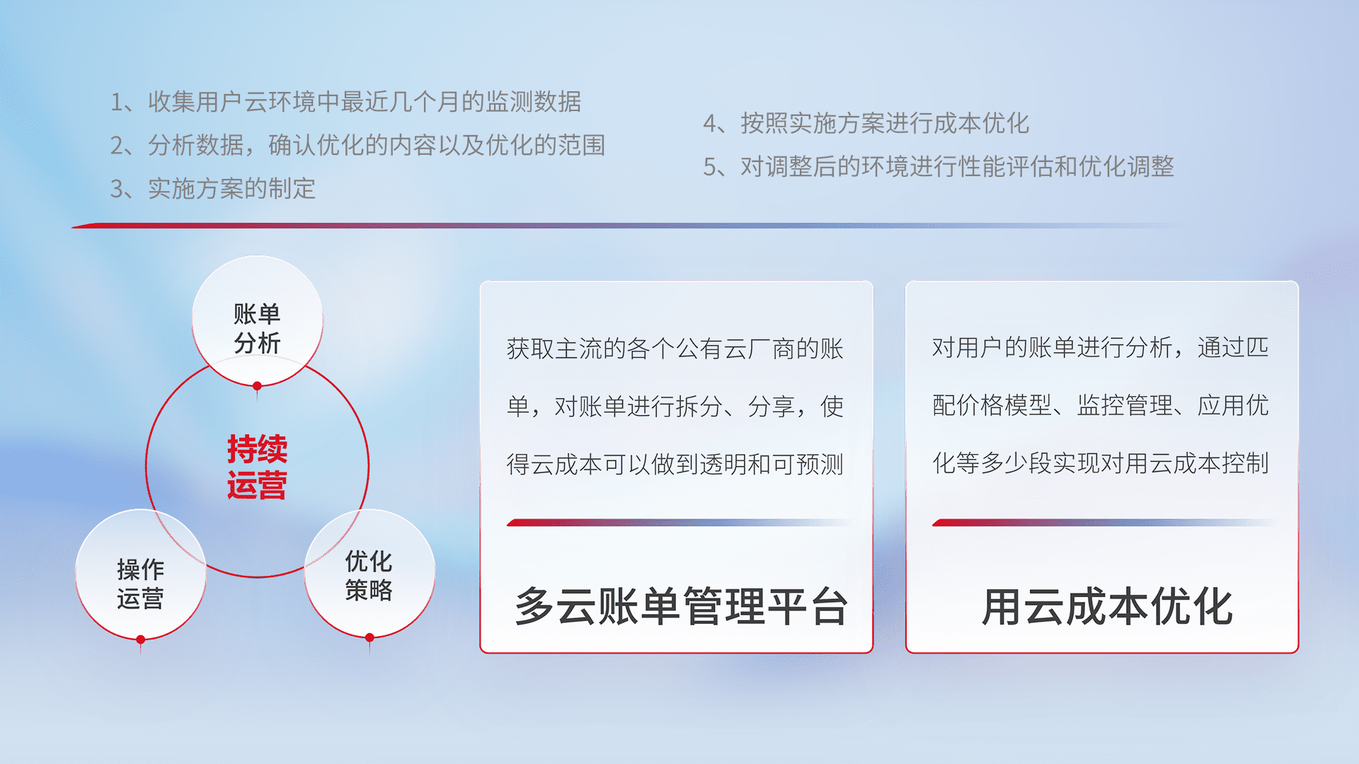 通过多云纳管,,以统一的资源数据模型把客户的云资源进行抽象和封装,,,,进而实现对多云资源的统一操作,,,保障云资源管理的可靠性、、稳定性与可用性。。。。量身定制化运维内容,,配置、、开发运维、、补丁管理、、备份、、、监控、、、、认证和访问管理、、、审计和日常巡检等,,保障在用云过程中的可靠度,,,,稳定度以及高可用率。。。